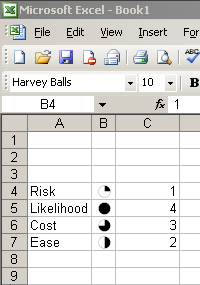 In the screen shots, column B simply has the numbers 1, 4, 3 and 2 (shown in Column C for clarity). Naturally, you can also use this in PowerPoint, Word or any other application. The neat thing about using it in Excel is that you can make the Harvey Balls variable by making a formula that results in a number from 0-9. Like any other font, you can also change the size/colour.
